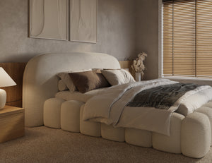 La tête de lit, doucement arrondie et rembourrée, est une véritable pièce maîtresse. Avec ses 95 cm de hauteur et 20 cm d'épaisseur , son revêtement moelleux en peluche et sa silhouette organique allient élégance visuelle et confort suprême , idéal pour lire ou se détendre le soir.