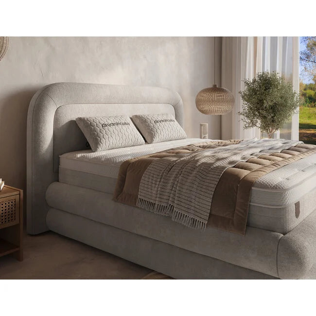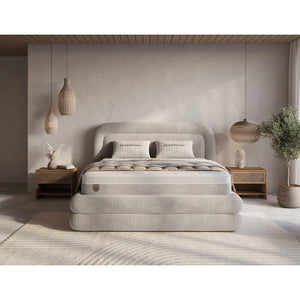 Le lit Japandi Halo allie design scandinave minimaliste et harmonie d'inspiration japonaise. Revêtu d'un luxueux tissu bouclé taupe , il allie chaleur et sophistication tout en offrant un généreux espace de rangement dissimulé. Un véritable équilibre entre confort, élégance et praticité, idéal pour les intérieurs modernes.
