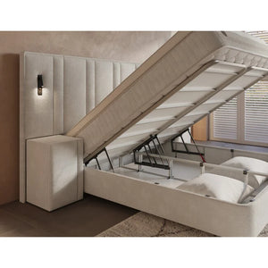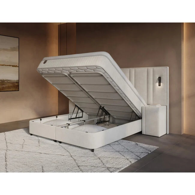 Sous son extérieur serein se cache une véritable innovation. Le système de rangement intelligent , actionné sans effort par des vérins à gaz de 1 000 N , offre un espace généreux pour la literie et les essentiels, tandis que les ports de charge intégrés permettent de recharger vos appareils toute la nuit.