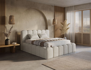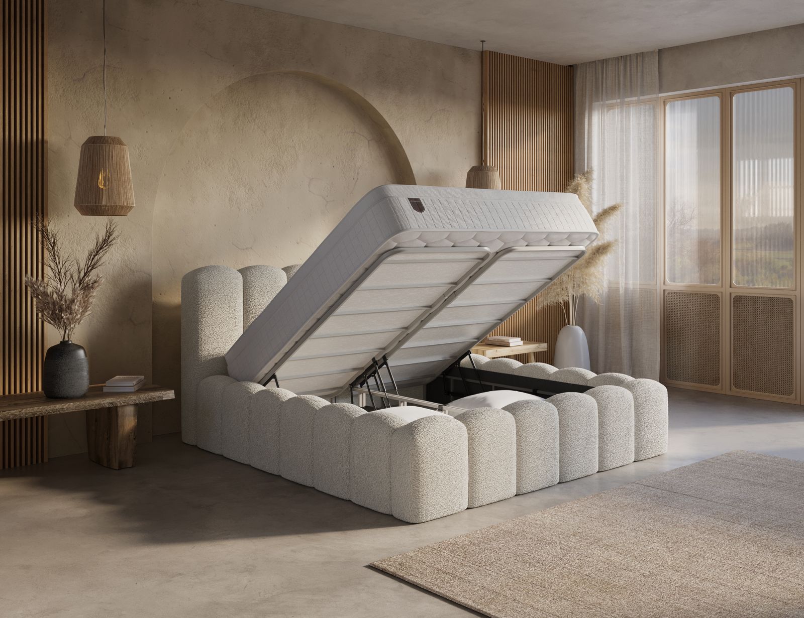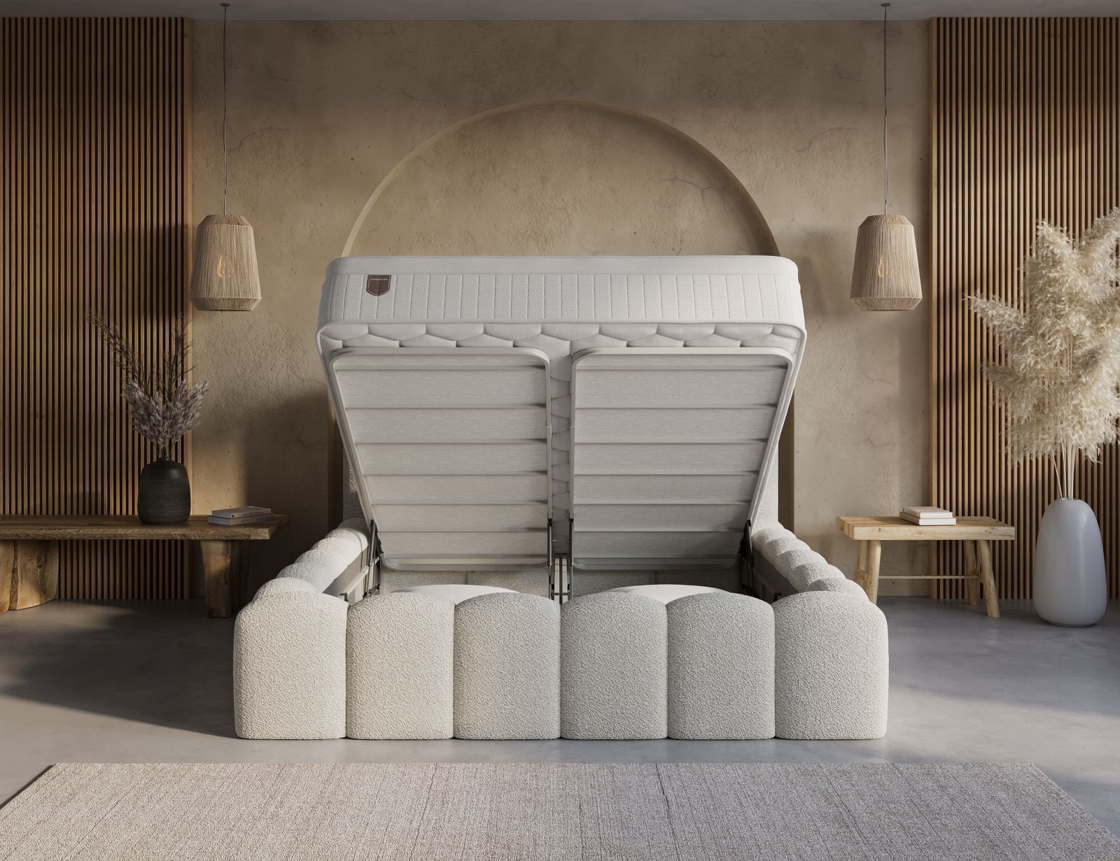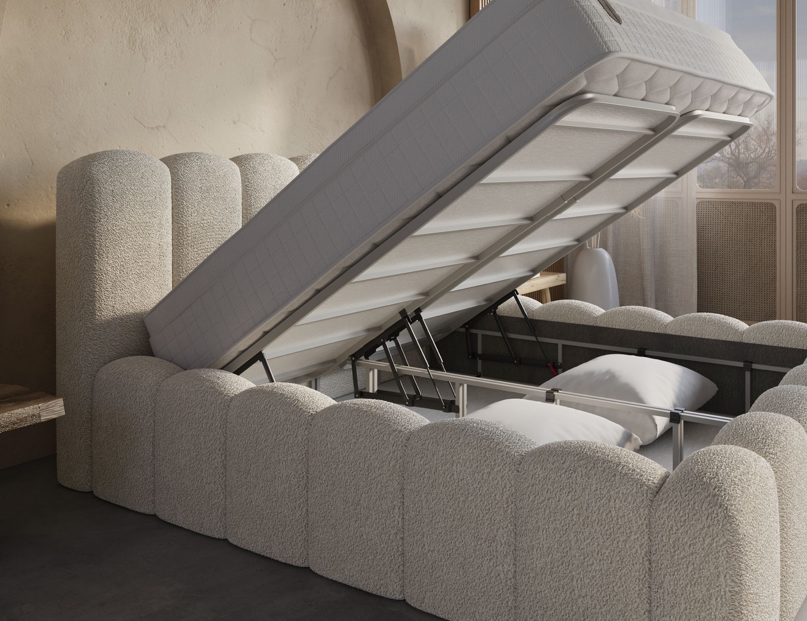 Ce sommier exclusif, revêtu d'un tissu peluche à la texture riche et aux contours doux et arrondis, apporte une ambiance sereine, chaleureuse et raffinée à tout intérieur. Son système de rangement entièrement intégré s'ouvre sans effort grâce à des vérins à gaz haute performance, offrant un espace de rangement dissimulé généreux sans compromettre la pureté et le minimalisme de son design.