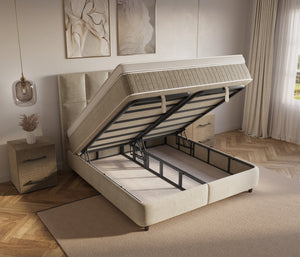 Le système de rangement intégré offre un espace généreux pour la literie ou les effets personnels, facilement accessible grâce à un mécanisme à vérin à gaz à ouverture douce et à deux poignées. Son cadre en alliage de carbone robuste assure stabilité et soutien durables, tandis que le sommier confort à 5 zones favorise une posture de sommeil ergonomique et saine.