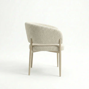 Revêtue d'un tissu texturé haut de gamme, l'assise offre un confort chaleureux et tactile, idéal pour de longs moments de détente à table. Les pieds en bois massif, finition beige profond, contrastent élégamment avec la clarté du revêtement et garantissent une stabilité et une durabilité exceptionnelles. Chaque détail a été soigneusement pensé, faisant de cette chaise un élément incontournable des salles à manger modernes, de style Japandi ou luxueuses.