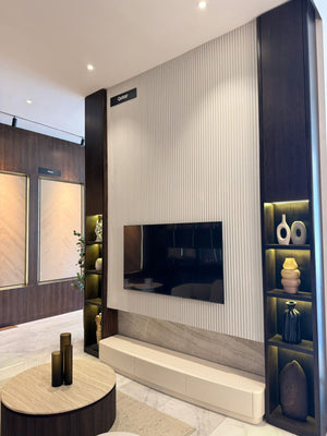 Le Cinewall Qatar est un chef-d'œuvre de design moderne, alliant élégance, fonctionnalité et luxe dans une pièce raffinée. Avec ses lignes verticales épurées et le contraste sophistiqué entre les touches de bois foncé et les panneaux aux tons doux, ce Cinewall transforme tout espace de vie en une expérience intérieure haut de gamme.