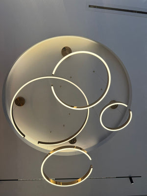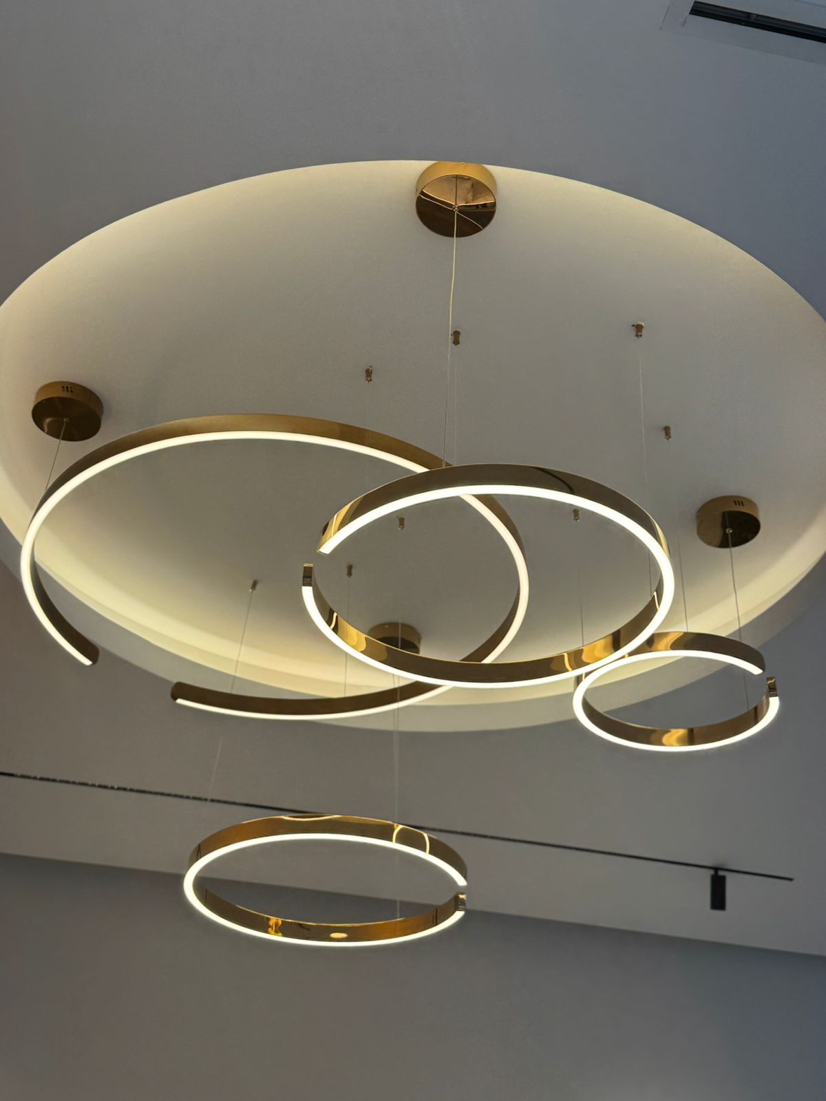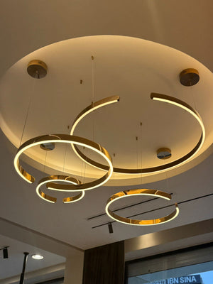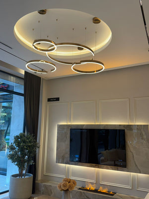 Illuminate your space with the New York LED Chandelier, a statement piece that defines modern elegance. Designed with a series of floating golden rings, this pendant light combines architectural precision with a warm, ambient glow.