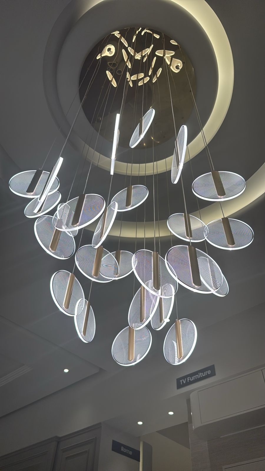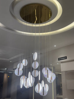 Sublimez votre intérieur avec le Véla Aurea , un lustre époustouflant alliant art et sophistication. Conçu avec une cascade de disques dorés suspendus en parfaite harmonie, ce luminaire exceptionnel transforme la lumière en un spectacle fascinant d'élégance et de modernité.