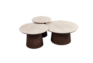 Chaque table présente un plateau en céramique beige raffinée aux veinures naturelles subtiles, offrant un équilibre visuel serein et organique. Les surfaces arrondies reposent sur des pieds cannelés brun foncé , créant un contraste saisissant de textures et de tons. La silhouette sculptée s'inspire des formes architecturales, rendant l'ensemble à la fois fonctionnel et visuellement captivant.