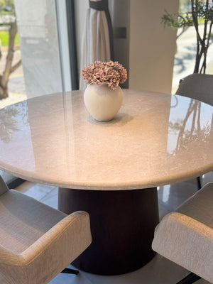Le plateau est réalisé en marbre de première qualité , réputé pour sa surface lisse, ses veinures naturelles et son éclat subtil qui reflète la lumière avec élégance. Sa forme ronde et gracieuse crée une atmosphère chaleureuse, idéale pour les dîners intimes ou les réceptions raffinées.